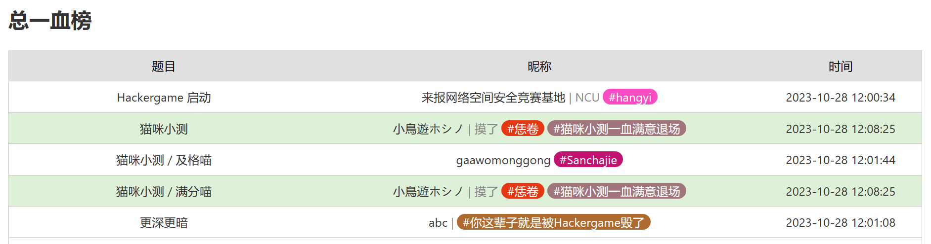 今年也玩得挺开心的,还拿到了猫咪小测的一血,更开心了喵。